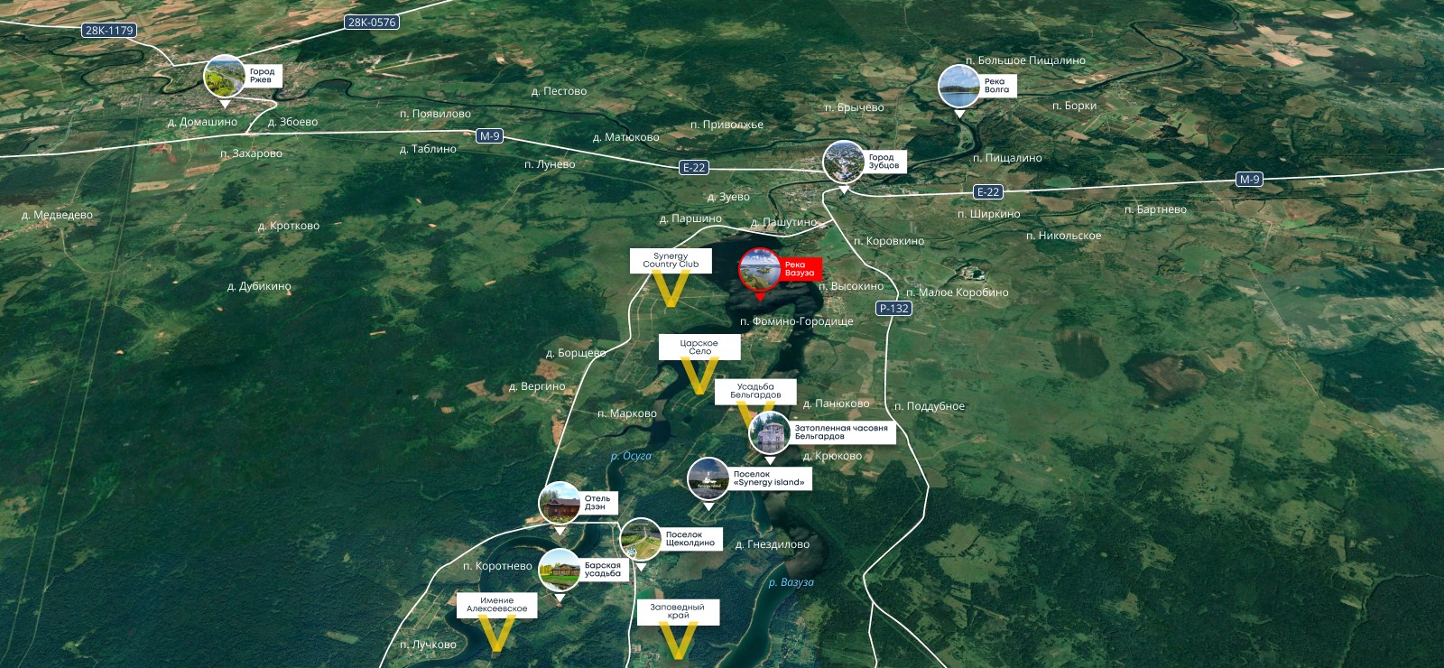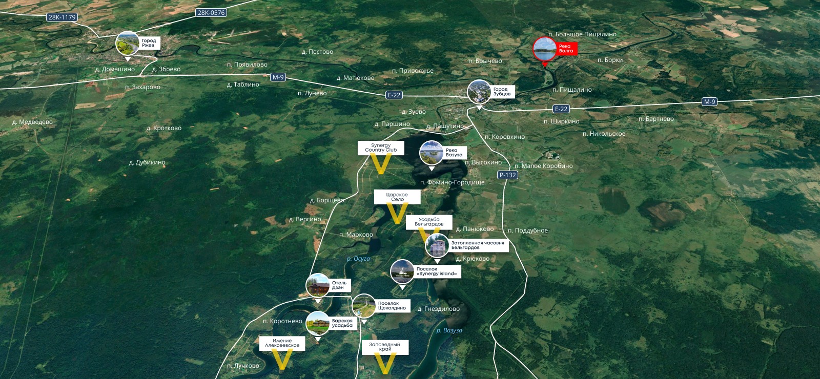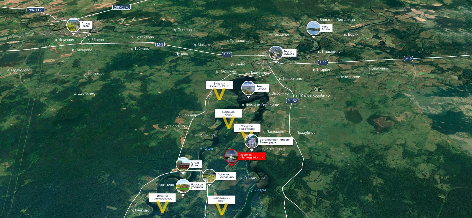 Проект расположен на полуострове Вазузского водохранилища. Уединенность этого места удачно сочетается с транспортной доступностью: 2 часа от Москвы по скоростному Новорижскому шоссе. Участки площадью от 10 соток, собственный выход к воде, запроектированы гостевые дома, детские и спортивные площадки, пляж.