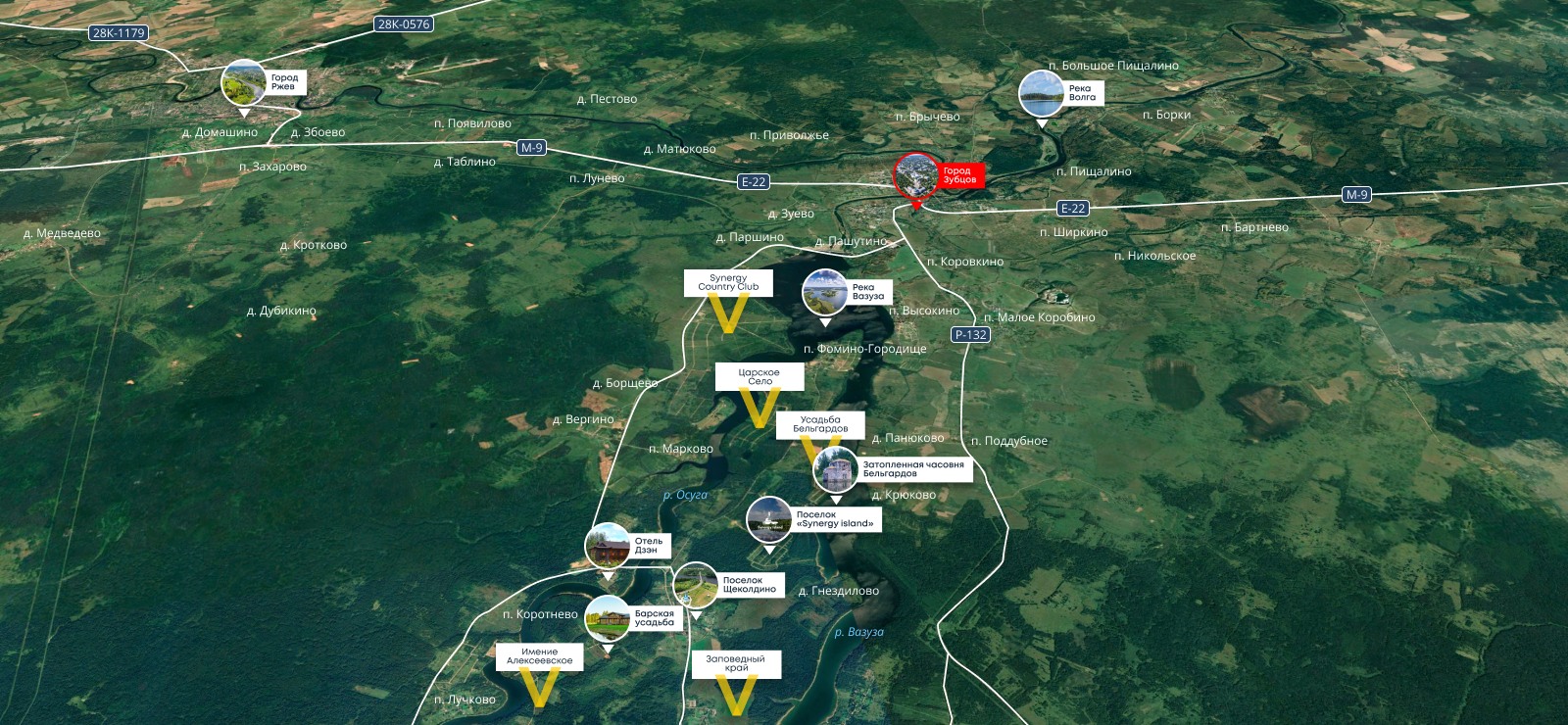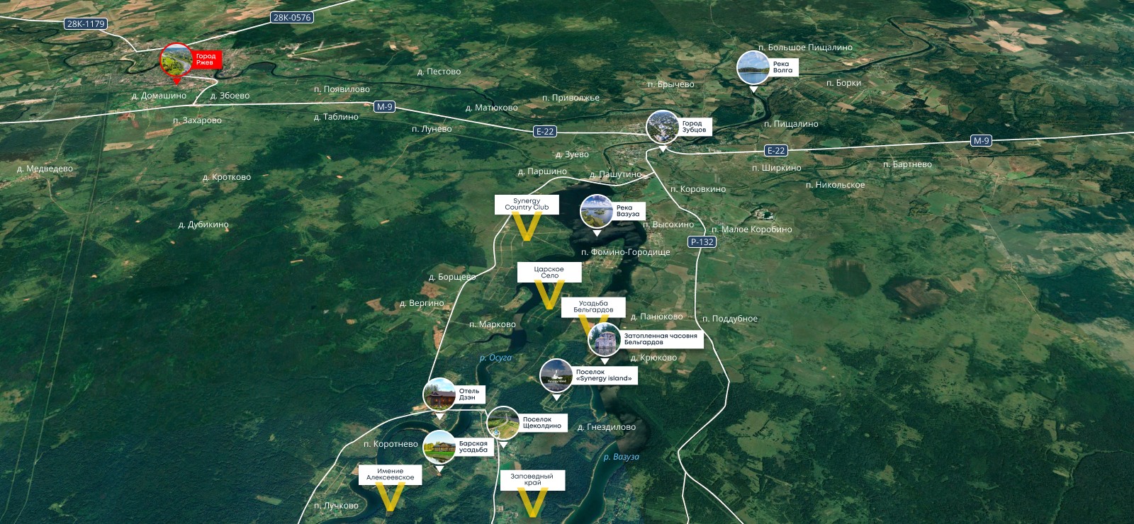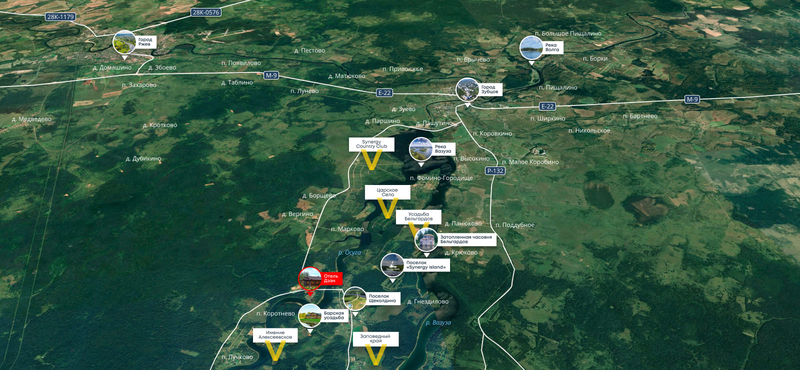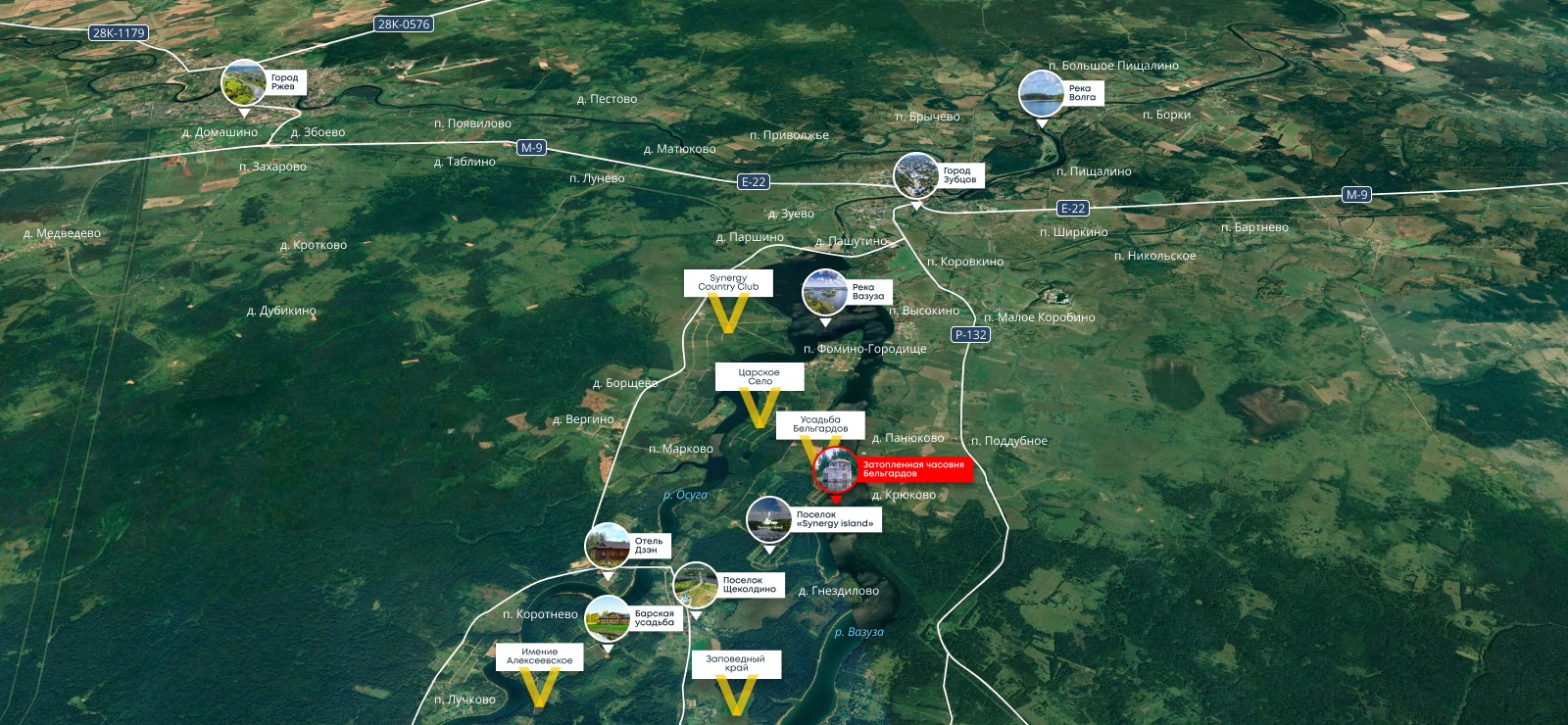 Проект расположен на полуострове Вазузского водохранилища. Уединенность этого места удачно сочетается с транспортной доступностью: 2 часа от Москвы по скоростному Новорижскому шоссе. Участки площадью от 10 соток, собственный выход к воде, запроектированы гостевые дома, детские и спортивные площадки, пляж.